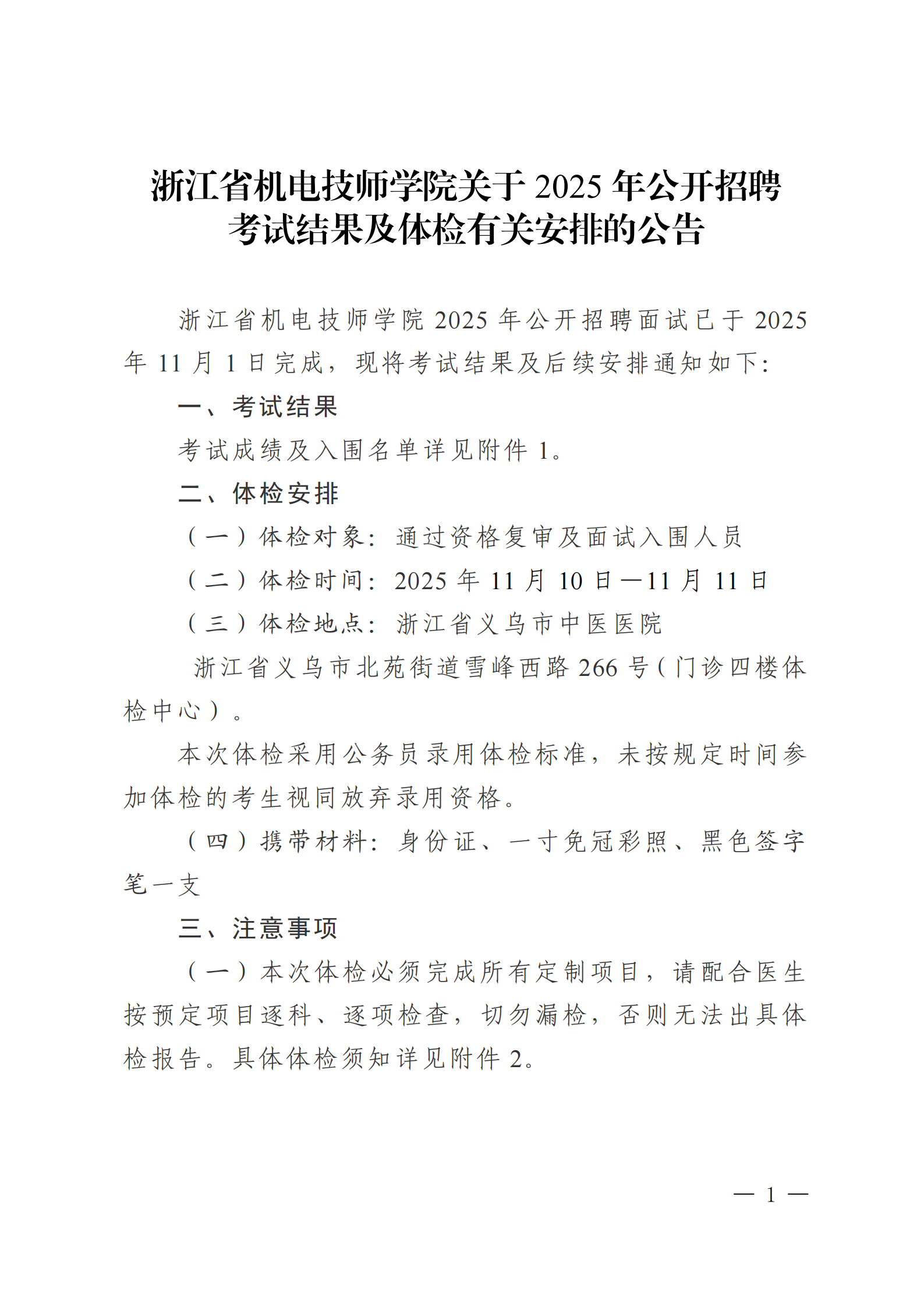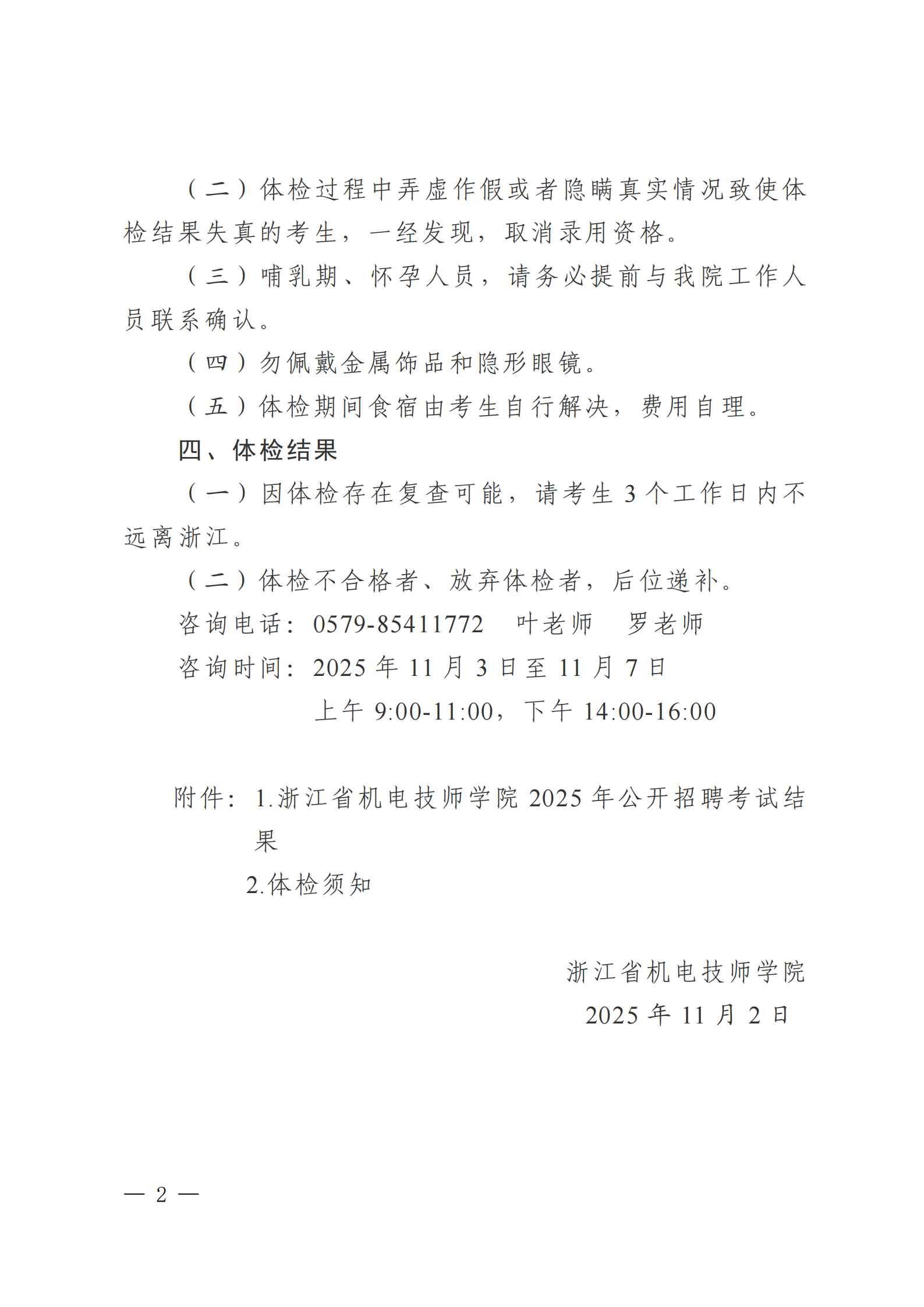 浙江省机电技师学院关于2025年公开招聘考试结果及体检有关安排的公告