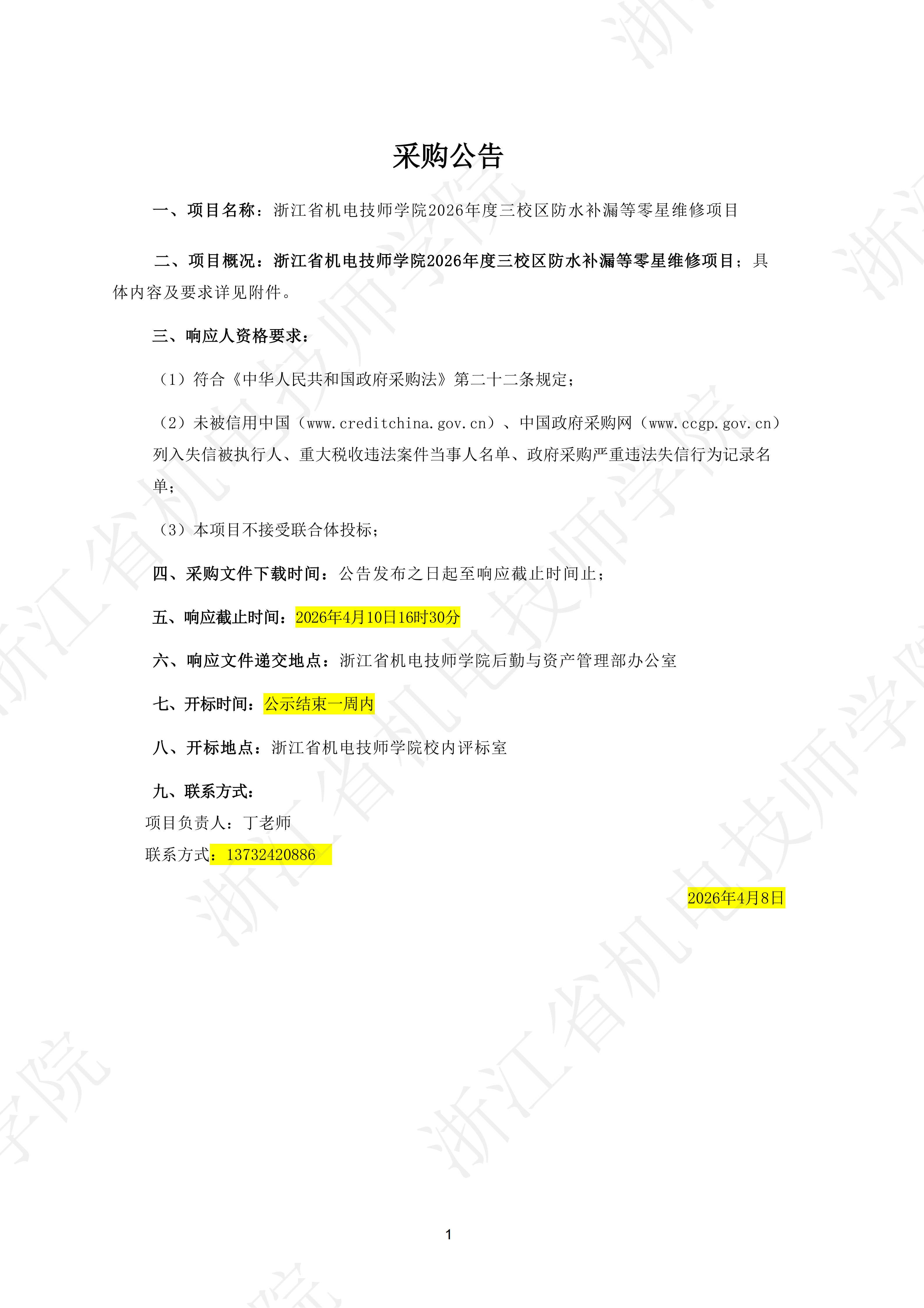 浙江省机电技师学院2026年度三校区防水补漏等零星维修项目采购公告