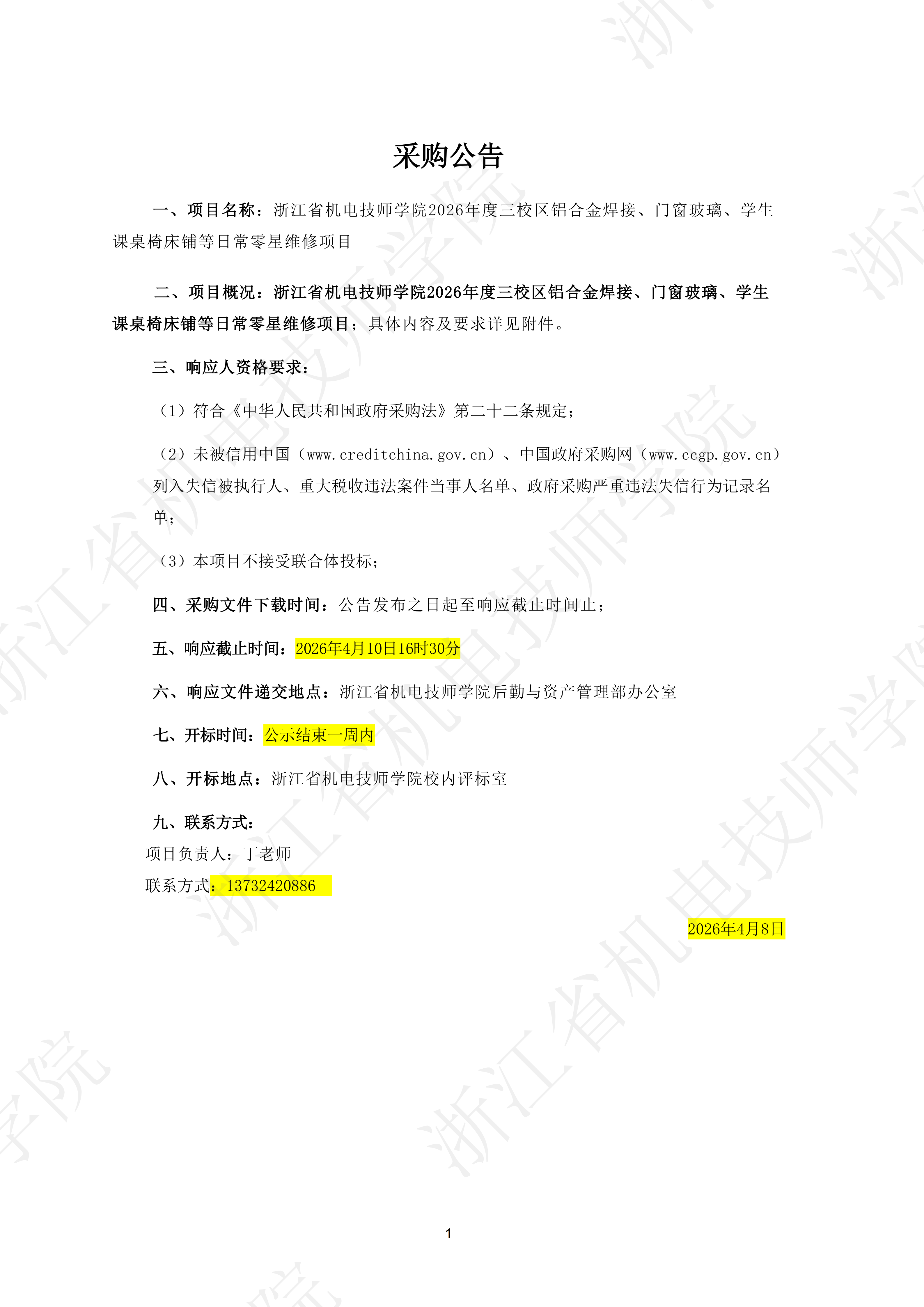 浙江省机电技师学院2026年度三校区铝合金焊接、门窗玻璃、学生课桌椅床铺等日常零星维修项目采购公告