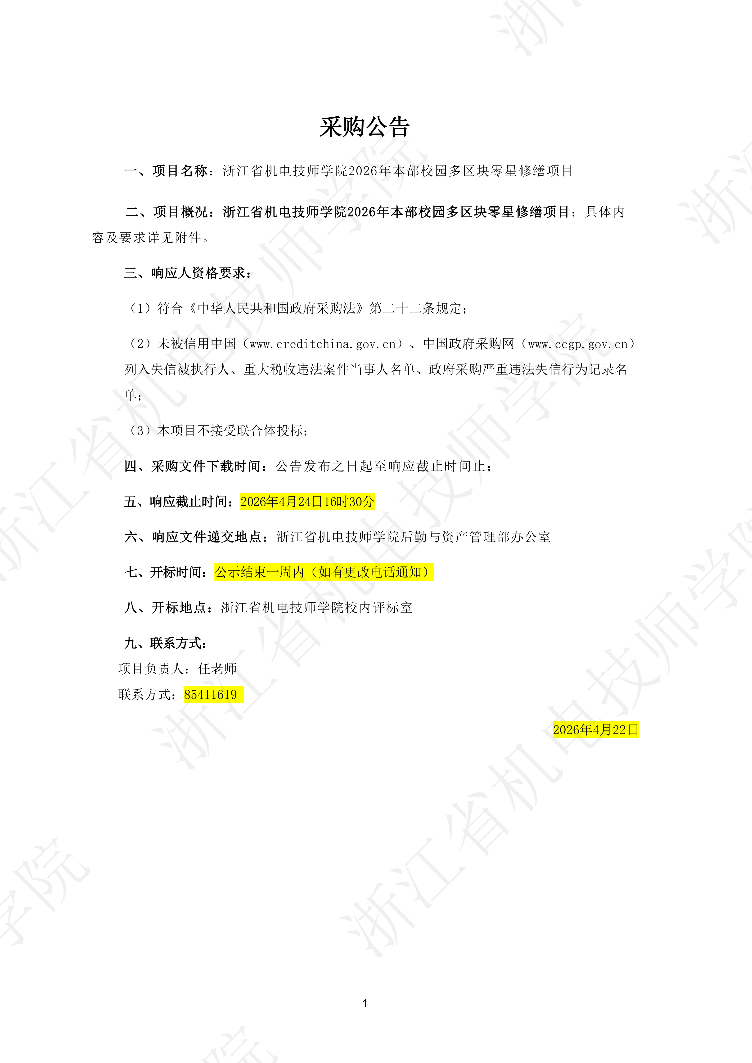 浙江省机电技师学院2026年本部校园多区块零星修缮项目采购公告