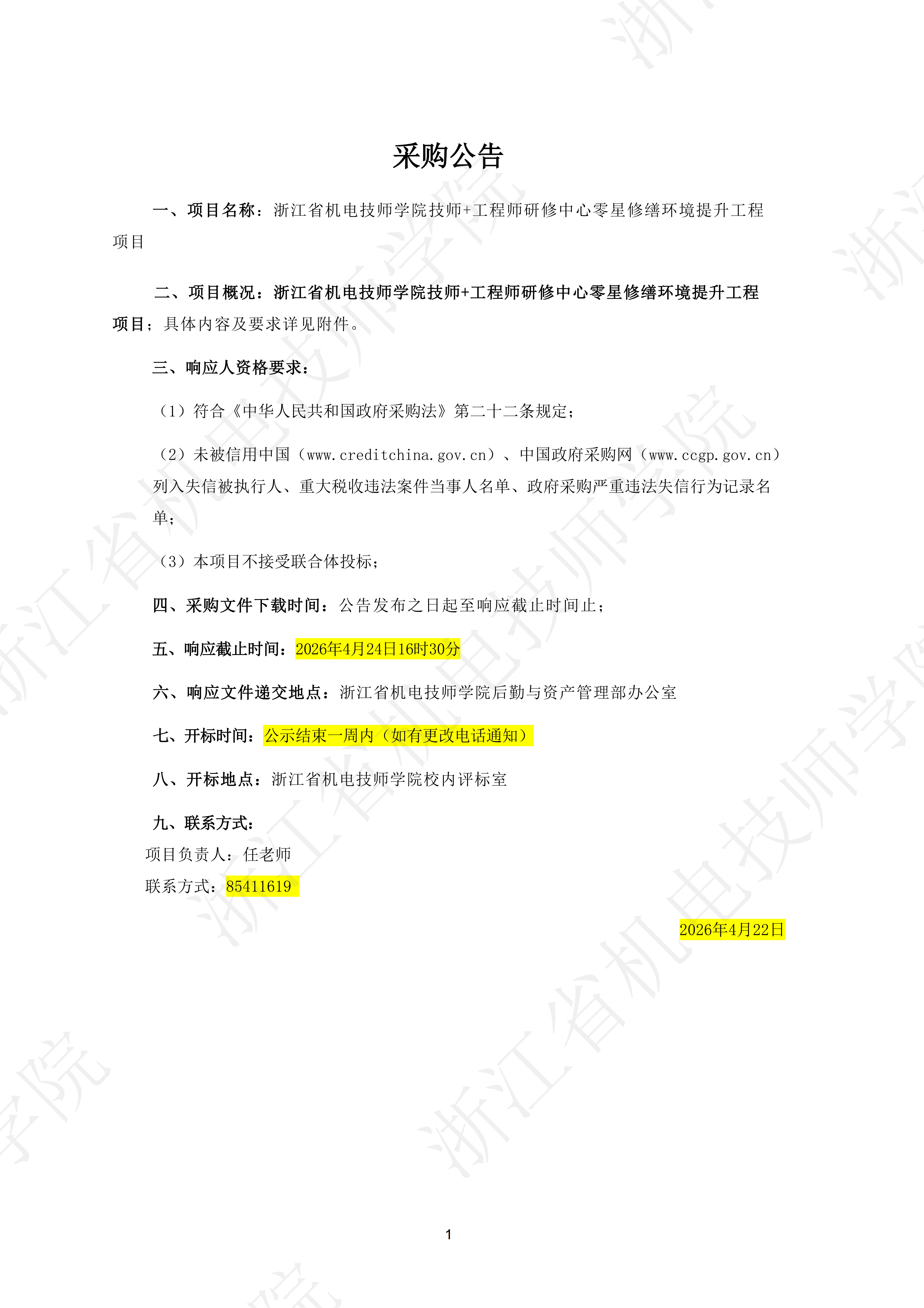 浙江省机电技师学院技师+工程师研修中心零星修缮环境提升工程项目采购公告