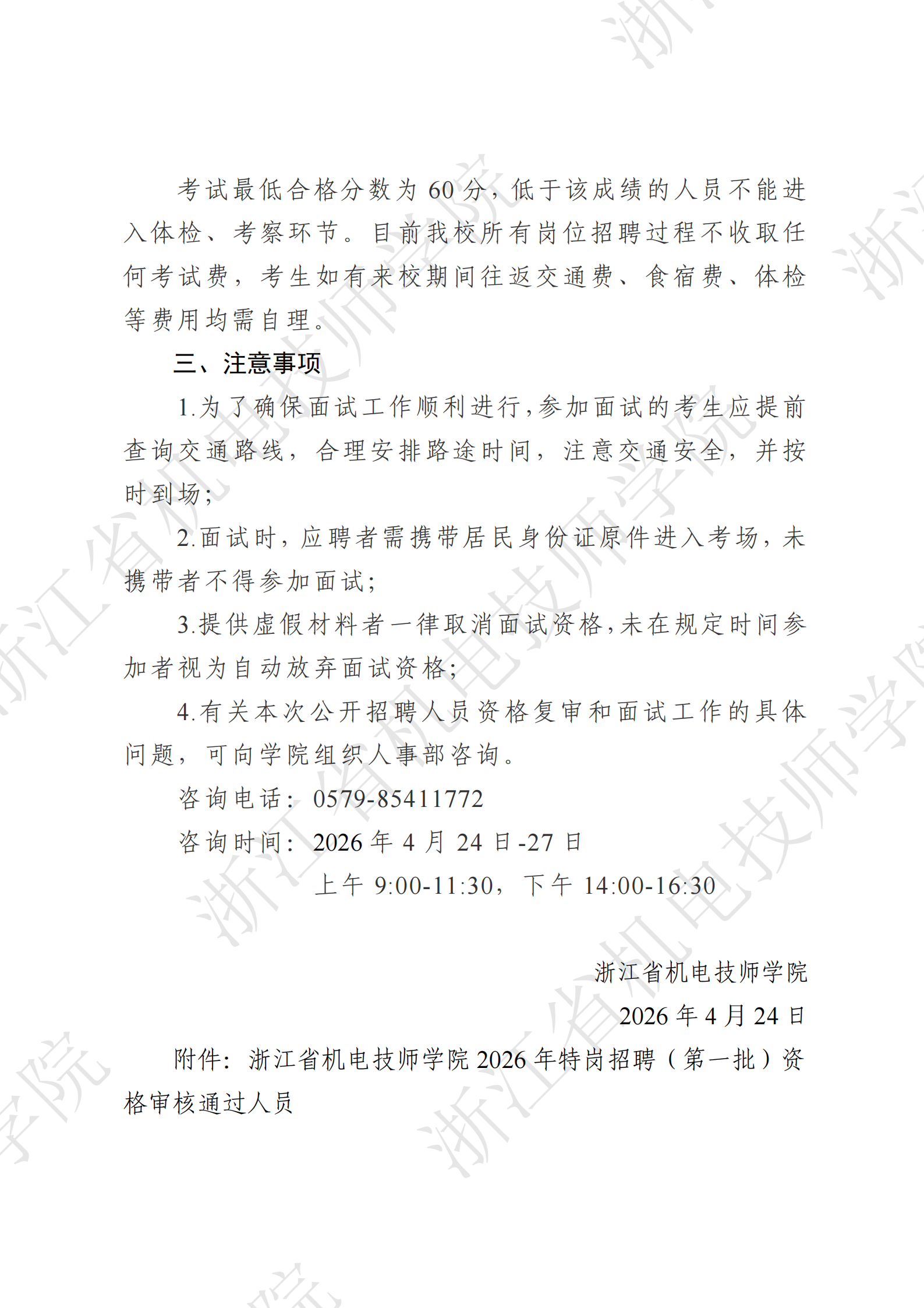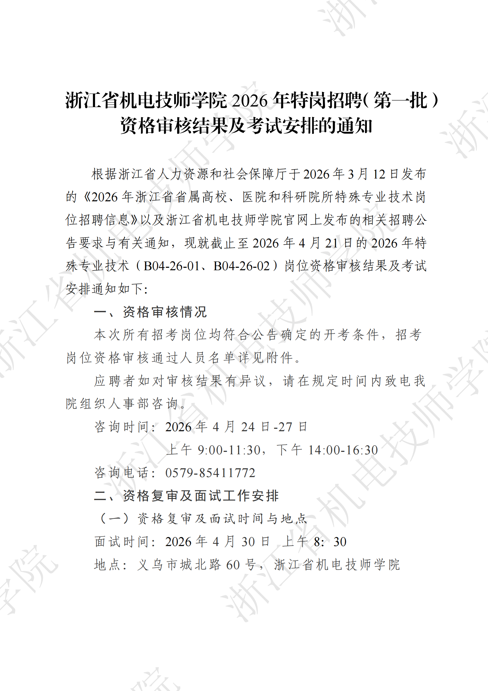 浙江省机电技师学院2026年特岗招聘(第一批)资格审核结果及考试安排的通知