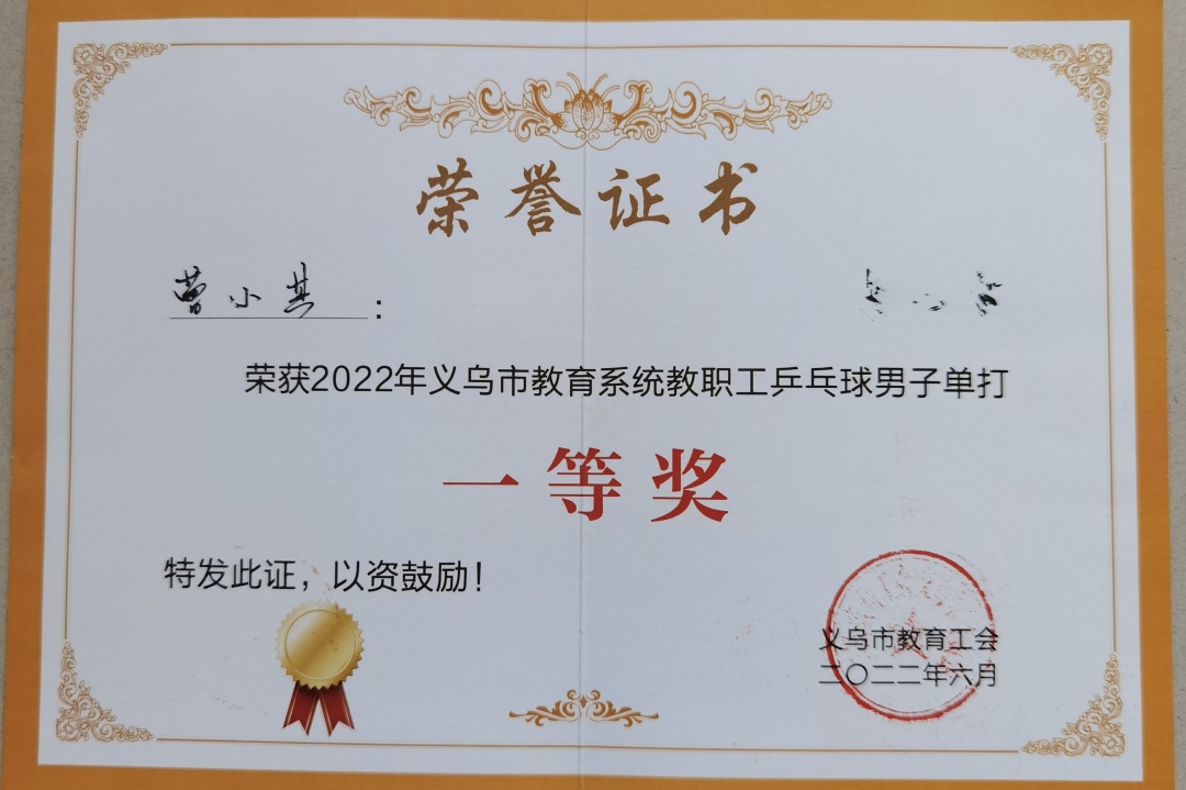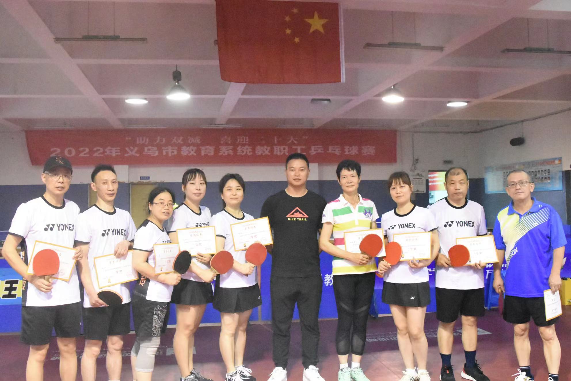▶我院代表队在义乌市教育工会主办的“助力双减 喜迎亚运”教职工乒乓球比赛中分别获得男子团体一等奖,女子团体二等奖。曹小其院长荣获男子单打一等奖。