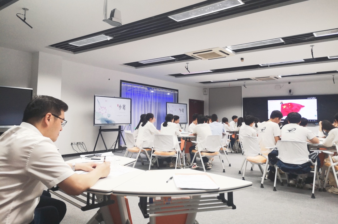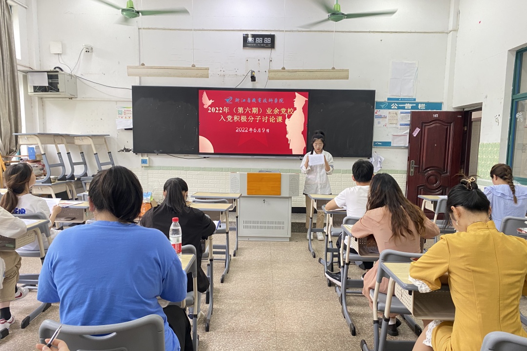 ▶2022年(第六期)业余党校全体学员在教学楼一楼教室开展讨论课。