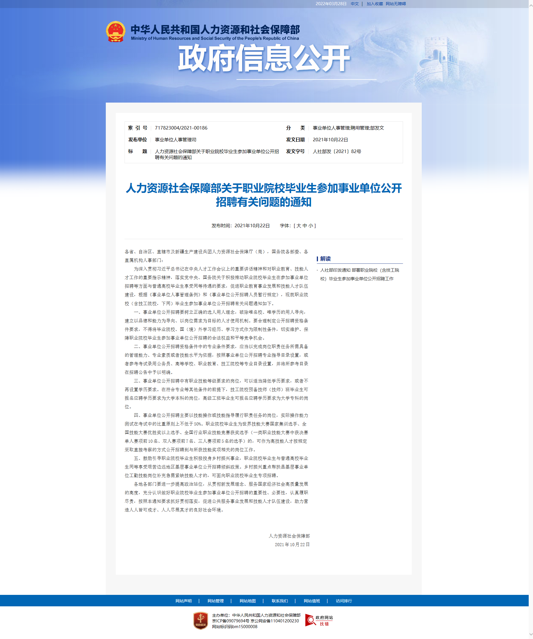 各地各部门要进一步提高政治站位,从贯彻新发展理念、服务国家经济社会高质量发展的高度,充分认识做好职业院校毕业生参加事业单位公开招聘的重要性、必要性,认真履职尽责,按照本通知要求抓好贯彻落实,促进公共服务事业发展和技能人才队伍建设,助力营造人人皆可成才、人人尽展其才的良好社会环境。